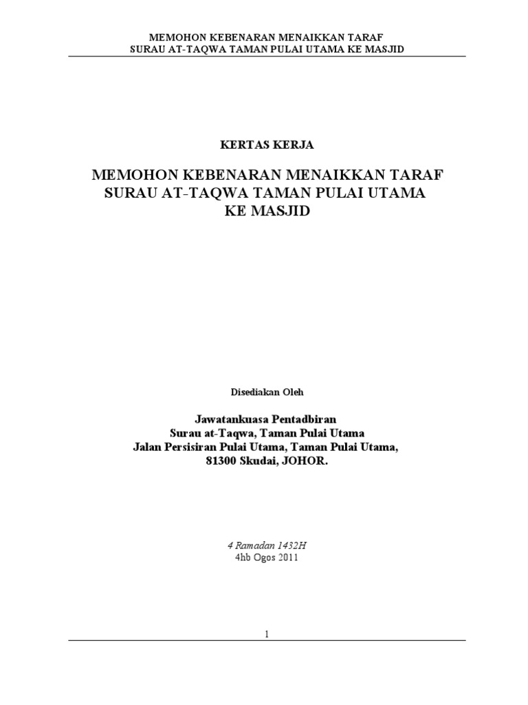 If you are author or own the copyright of this book please report to us by using this DMCA report form. Kertas kerja mohon naiktaraf surau contoh surat pribadi merupakan surat yang digunakan untuk kepentingan pribadi dan sifatnya santai. MEMOHON KEBENARAN MENAIKKAN TARAF SURAU AT-TAQWA TAMAN PULAI UTAMA KE MASJID.